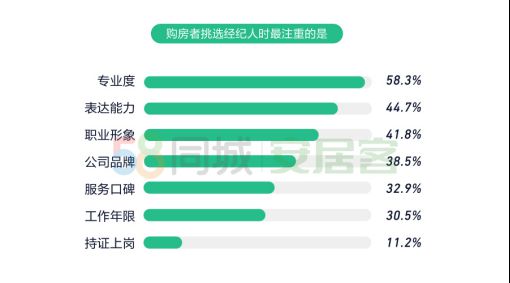 然而,房地產經紀人首先需要提升專業度。58安居客房產研究院、58房產經紀大學針對購房者的調研結果表明,除了選擇經紀公司品牌外,專業度、表達能力、職業形象是購房者挑選經紀人的重要參考指標。提供不實信息、不當承諾和專業度不高兩大選項,被列為購房者最不喜歡經紀人服務的前兩位。