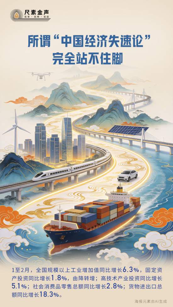 先看看剛發布的今年前兩個月的中國經濟數據:1至2月,全國規模以上工業增加值同比增長6.3%,固定資產投資同比增長1.8%,由降轉增﹔高技術產業投資同比增長5.1%﹔社會消費品零售總額同比增長2.8%﹔貨物進出口總額同比增長18.3%。開年就有這樣的表現,哪兒有“失速”“疲軟”的樣子?