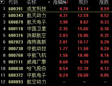 新华网消息 24日早盘,航空航天股延续昨日强势,早盘再度领涨两市。截至发稿成发科技领涨4.70%,航天动力涨4.31%,航天电子涨3.98%,中国卫星涨2.35%,洪都航空涨2.03%。