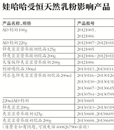 娃哈哈昨日通报,涉事的这批乳清蛋白共计14.475吨,被用于“钙好喝”等产品中,相关产品从2012年10月出厂销售,基本已销售完毕。