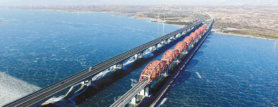 1月13日,2022年冬奥会重点项目——京张高铁官厅水库特大桥进京方向铺轨完成。作为京张高铁全线的控制性工程之一,京张高铁官厅水库特大桥全长9077米、跨越官厅水库,是国内首例适用于350公里时速有砟轨道高速铁路的钢桁梁铁路桥。京张高铁全长174公里,设计时速350公里,预计2019年底建成通车。自去年11月1日全线开始铺轨作业以来,截至目前,铺轨完成全线的33%。图为中铁三局大型机械设备、工人在河北怀来京张高铁官厅水库特大桥进行铺轨作业。