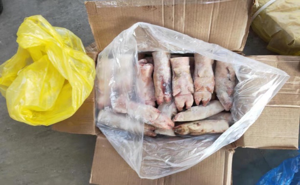 在湖南,900千克无防疫和检验检疫证明的进口猪脚被查获。