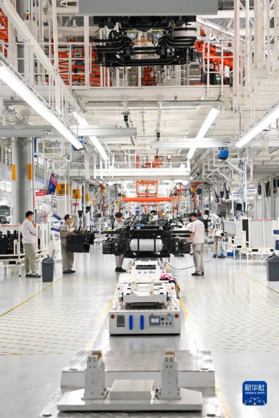 在位于吉林长春的一汽解放J7智能工厂内,工人在生产线上装配车辆(6月12日摄)。