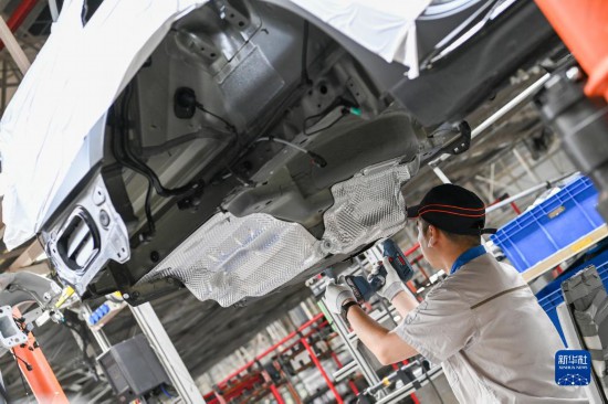 在位于吉林长春的一汽-大众长春生产整车制造一部总装一车间,工人在生产线上装配车辆(6月12日摄)。