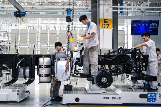 在位于吉林长春的一汽解放J7智能工厂内,工人在生产线上装配车辆(6月12日摄)。