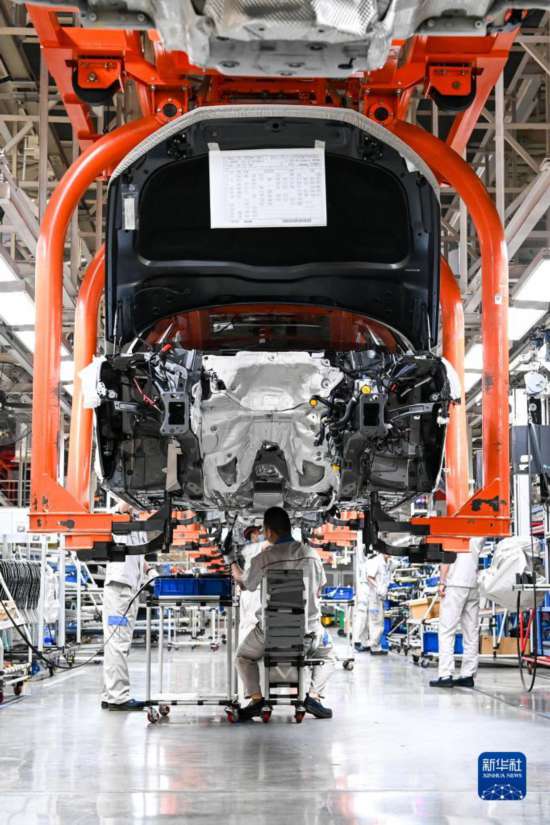 在位于吉林长春的一汽-大众长春生产整车制造一部总装一车间,工人在生产线上装配车辆(6月12日摄)。