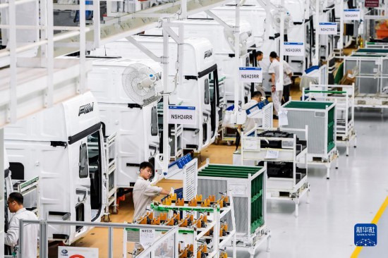 工作人员在一汽解放J7智能工厂内进行车辆装配作业(6月27日摄)。