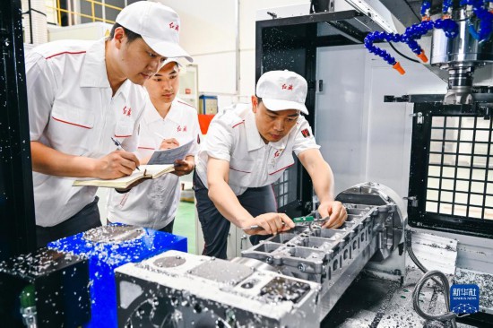 杨永修(右)在检查试制零部件的精度(6月8日摄)。杨永修是中国一汽研发总院高级技师,他攻克了高端发动机精密制造过程中的多项难关,获得全国技术能手、全国五一劳动奖章等多项荣誉。
