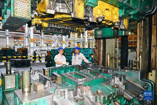 冯斌(左)检查冲压机床工作状态(6月8日摄)。冯斌是中国第一汽车集团有限公司旗下一汽解放汽车有限公司卡车厂的模具钳工。拥有20余年冲压生产工作经历的他先后获得企业、市级、省级“劳动模范”称号与全国五一劳动奖章。