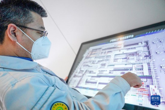 在位于吉林长春的一汽解放J7智能工厂内,车间主任王一强在智造运营平台的电子屏上查看生产情况(2022年12月27日摄)。