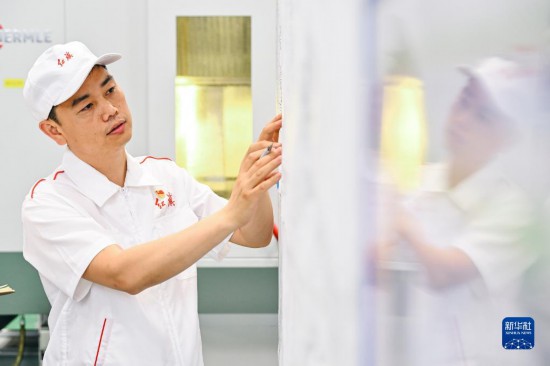 杨永修查看发动机图纸细节(6月8日摄)。杨永修是中国一汽研发总院高级技师,他攻克了高端发动机精密制造过程中的多项难关,获得全国技术能手、全国五一劳动奖章等多项荣誉。