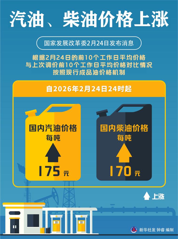 新华社北京2月24日电(记者魏玉坤、何晓)国家发展改革委24日发布消息,近期国际市场油价波动上升,根据2月24日的前10个工作日平均价格与上次调价前10个工作日平均价格对比情况,按照现行成品油价格机制,自2月24日24时起,国内汽、柴油价格每吨分别上涨175元和170元。